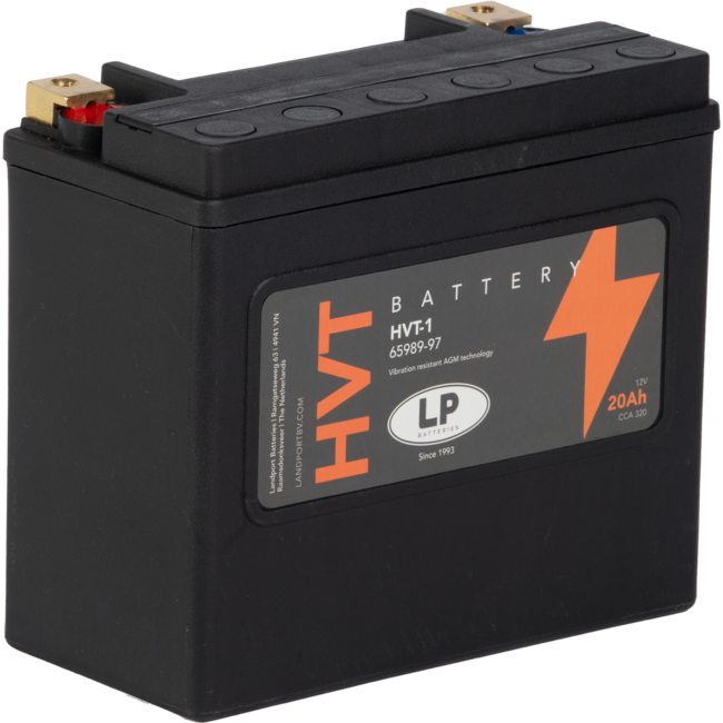 De HVT-1 Harley accu is 12 volt en 20 ah (type 65989-97) en is van het merk Landport (LP). De HVT motoraccu's zijn gemaakt voor de zware V-Twin motoren, voor deze motoren is een hoog koudstart vermogen een must en bij de HVT is daar extra rekening mee gehouden. HVT is een AGM accu (AGM / glasvezel technologie) die compleet gesloten is en onderhoudsvrij, dit wordt ook vaak als SLA-uitvoering aangeduid. De HVT is voorzien van een hittebestendige accubak die tegen extreme trillingen kan. De HVT is 100% lekvrij en kan in iedere positie gemonteerd worden. Voor Harley Davidson en natuurlijk de andere motoren is de HVT de ideale accu. HVT wordt gevuld en geladen geleverd en is dus direct klaar voor gebruik. Een accu met dezelfde specificaties is de HVTG20H-3 deze accu heeft ook een hittebestendige accubak.