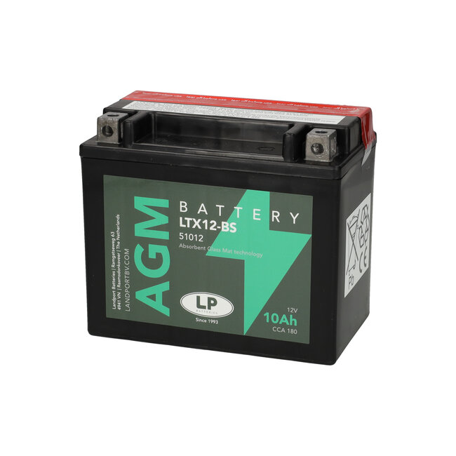 De LTX12-BS 12 volt 10,0 ah (51012 - YTX12-BS) AGM motoraccu is van het merk Landport (LP). De AGM (Absorbing Glass Material) motoraccu is een onderhoudsvrije gesloten motoraccu. Voor elke Motor, Brommer, Scooter, Grasmaaier, Quad, Waterscooter, Jetski en nog veel meer, een passende accu.