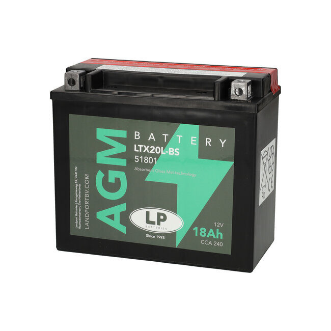 De LTX20L-BS 12 volt 18,0 ah (51801 - YTX20L-BS) AGM motoraccu is van het merk Landport (LP). De AGM (Absorbing Glass Material) motoraccu is een onderhoudsvrije gesloten motoraccu. Voor elke Motor, Brommer, Scooter, Grasmaaier, Quad, Waterscooter, Jetski en nog veel meer, een passende accu.